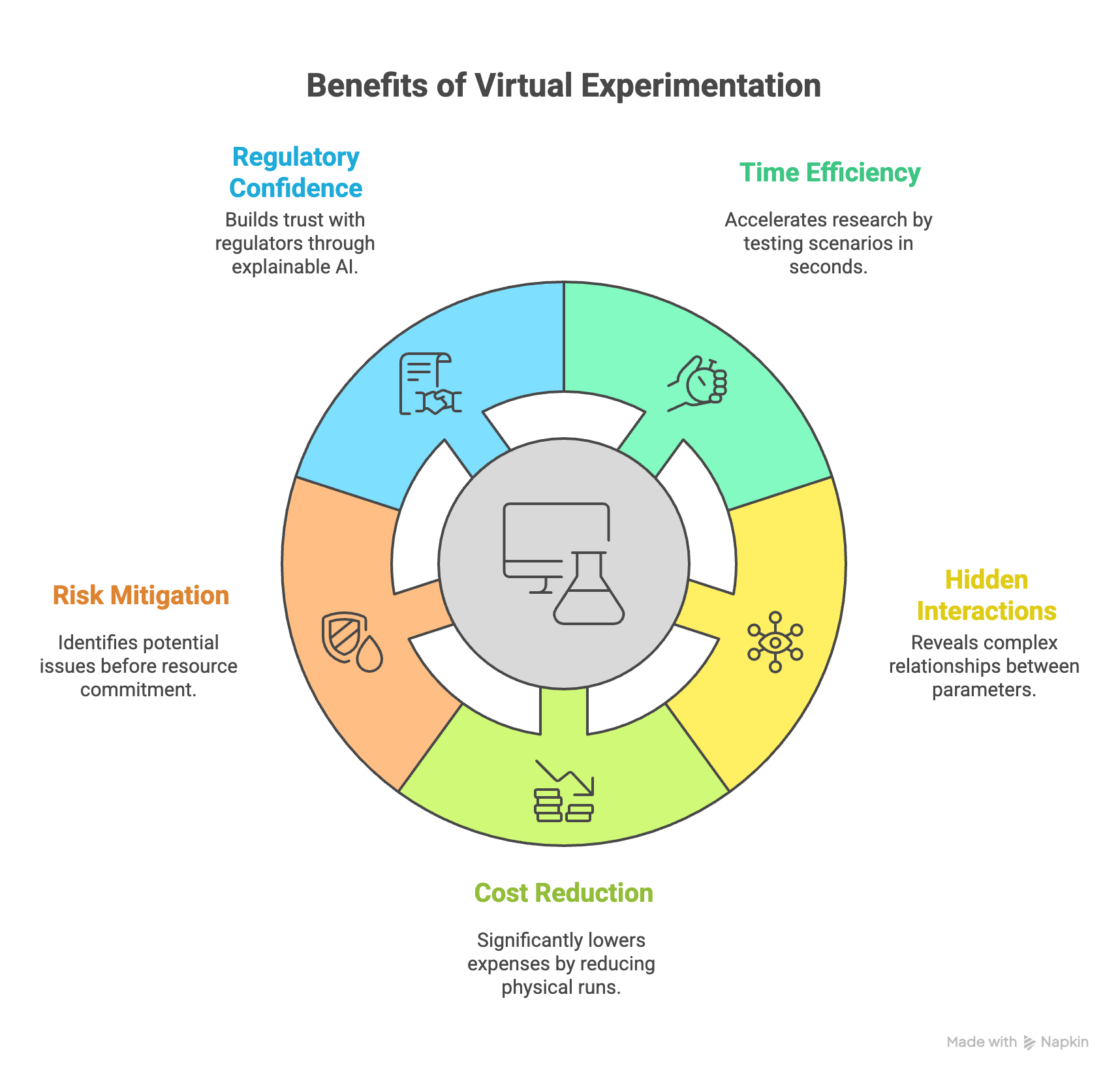 One important truth: virtual experimentation does not eliminate the need for labs. The lab remains critical for final confirmation, regulatory submissions, and scale-up testing.